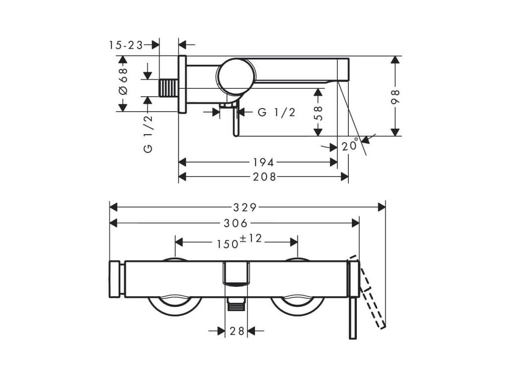 Vaňová stenová vodovodná batéria FINORIS značky Hansgrohe, s prepínačom tlaku Select s automatickým resetovaním. Batéria je dodávaná bez sprchového príslušenstva.