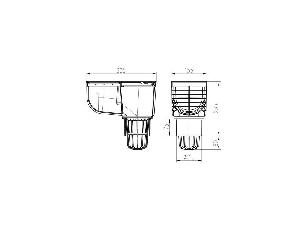 Použitie: pre odvod dažďových (povrchových) vôd do kanalizačných systémov mimo budov. Umožňuje pripojenie odkvapových zvodov.