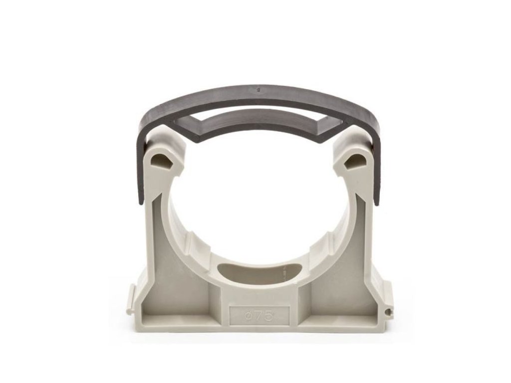 Príchytka na potrubie, so strmeňom, šedý plast - 90mm