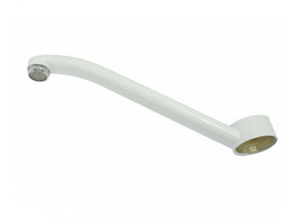 Biele liate ploché výtokové ramienko, osadené celokovovým perlátorom.
