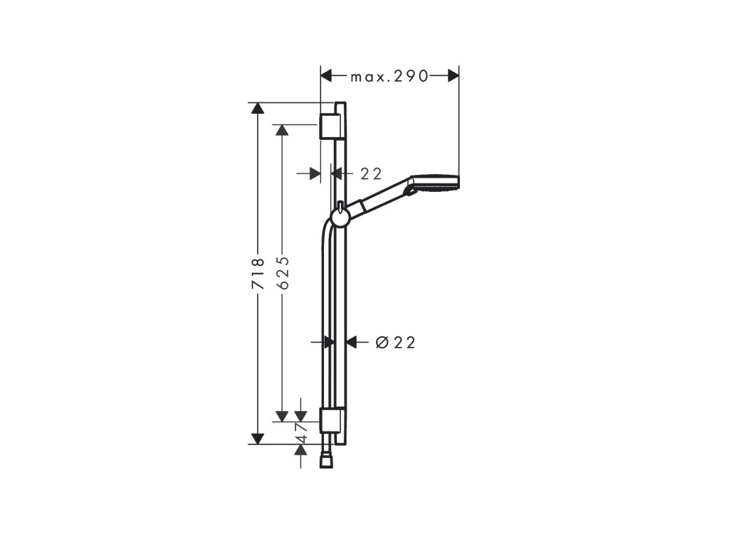 • sprchová tyč s dĺžkou 718 mm. Priemer tyče 22 mm, profil guľatý. Rozstup vŕtania: 625 mm.