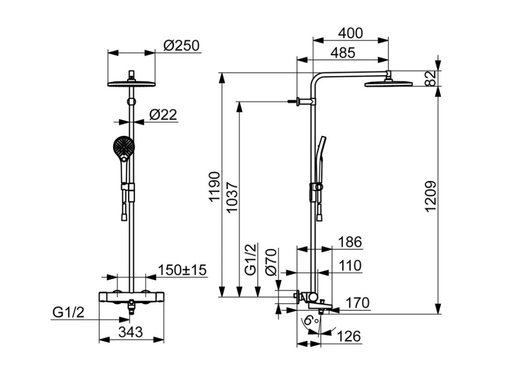 • sprchová tyč s nastaviteľným rozstupom úchytov, dĺžka tyče 1190 mm, priemer tyče 22 mm.