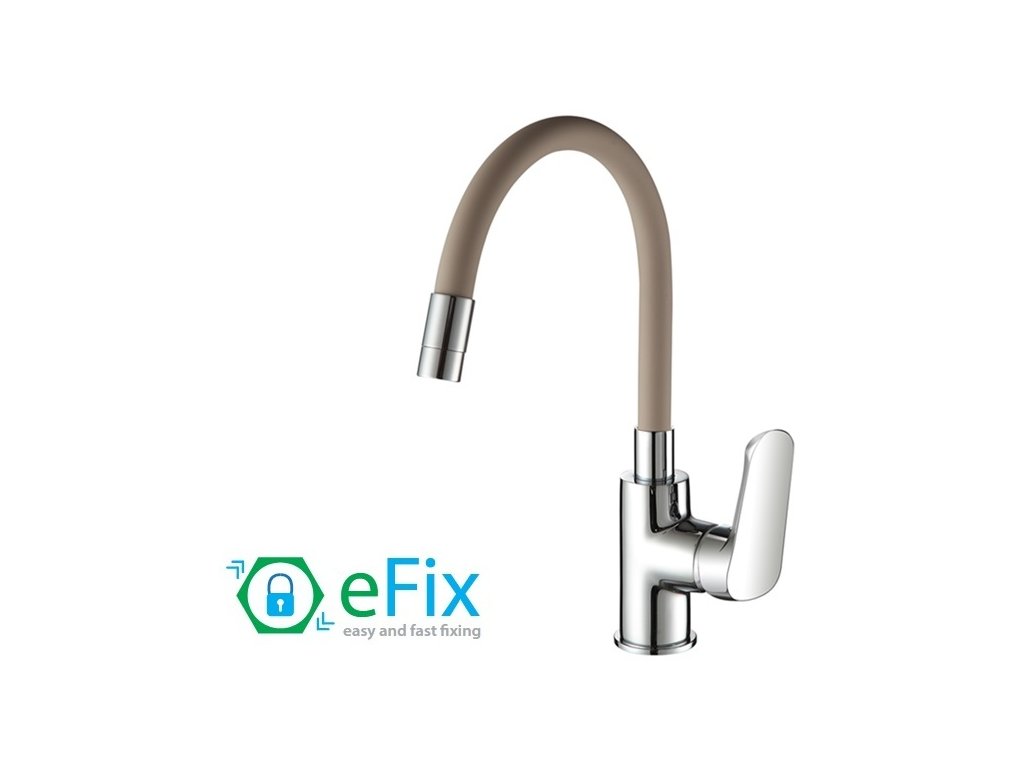 Štýlová umývadlová batéria VENUS od značky Sagittarius prináša do vašej kúpeľne sviežosť a štýl. Kombinácia lesklého chrómu a béžového flexibilného silikónového ramena vytvára zaujímavý kontrast. Ramienko je otočné o 360°, čo umožňuje pohodlné nasmerovanie prúdu vody presne tam, kde je to potrebné. Batéria je vybavená rýchloupínacím systémom eFix, ktorý zjednodušuje montáž aj demontáž – ideálne riešenie najmä pri ťažko prístupných miestach. Tento systém zároveň zaisťuje vyššiu stabilitu stojankových batérií.
